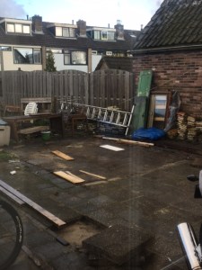 Als voorbereiding moesten we zelf de fundering uitmeten, deels uitgraven en voorzien van een laag schoon zand. Eerst moest het bestaande schuurtje weg. Daar bleek verrassend veel in te staan. We kregen al déjà vu’s van de verhuizing. De spullen werden binnen, op zolder en in de bijkeuken gestald waardoor ik steeds creatievere oplossingen moest bedenken om de wasmachine te bereiken. Wat niet meer paste, ging op een pallet in de tuin en werd liefdevol afgedekt met plastic.