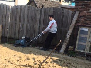 Na de bouw van de schuur kon er eindelijk gestraat worden. Dat had de nodige voeten in aarde. Het bedrijf dat het zou doen, had het druk. Heel erg druk. De eerste dagen was er ook weinig activiteit, afgezien van het weghalen van de bestaande betontegels. Halverwege de week konden we voor het eerst de stratenmakers verwelkomen. De vlag ging uit – ze waren er! En ze gingen warempel ook meteen volle bak aan de slag, met egaliseren, zand storten, banden plaatsen en dan – eindelijk! – straten, met de grote stapel klinkers die een week ervoor kunstig tussen de hortensia’s in de voortuin waren getakeld.