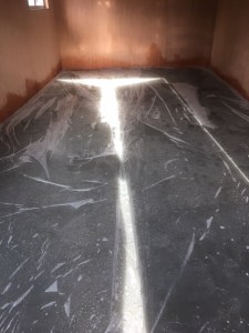 ’s Ochtends vroeg, stipt om half zeven stond er een busje op de stoep en daar waren ze: de betonmannen. Deze kwamen van nog verder weg – Polen – en wisten ons duidelijk te maken dat de betonwagen in aankomst was. Even later stond hij inderdaad voor de deur. Toen brak de stress uit: het laserapparaat van de mannen was stuk. Dat wilden ze oplossen door overal een duimstok in de grond te steken maar dat leek ons geen garantie voor een horizontale vloer. Gelukkig kregen ze hem aan de praat en kon er begonnen worden met storten. Alles ging goed, totdat iemand riep dat het beton op was. Het beton op? Jazeker, de firma had te weinig besteld. Twee telefoontjes later was een extra lading gelukkig ook geregeld. De stress niveau’s daalden weer. Verbouwen leidt vaak tot verassingen, weten we inmiddels uit ervaring – ons krijg je niet zo makkelijk gek!